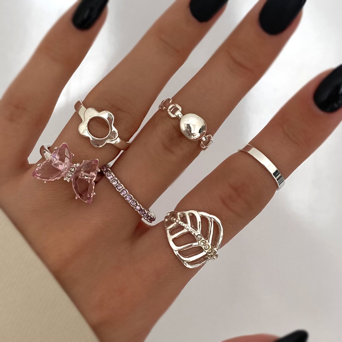 ست ۶ تایی انگشتر نقرهای با طراحی بهاری و مینیمال؛ سبک، ضدحساسیت و مناسب استفاده روزمره یا ساحلی برای دختران شاد.