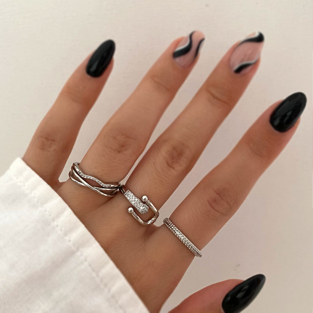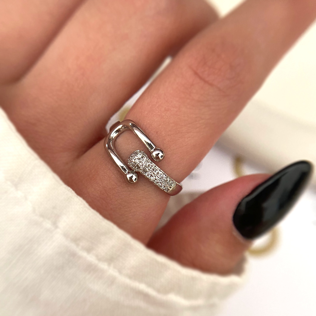 انگشتر نقرهای طرح یو نگیندار با خطوط نگینی ظریف. انتخابی متفاوت برای استایلهای خاص