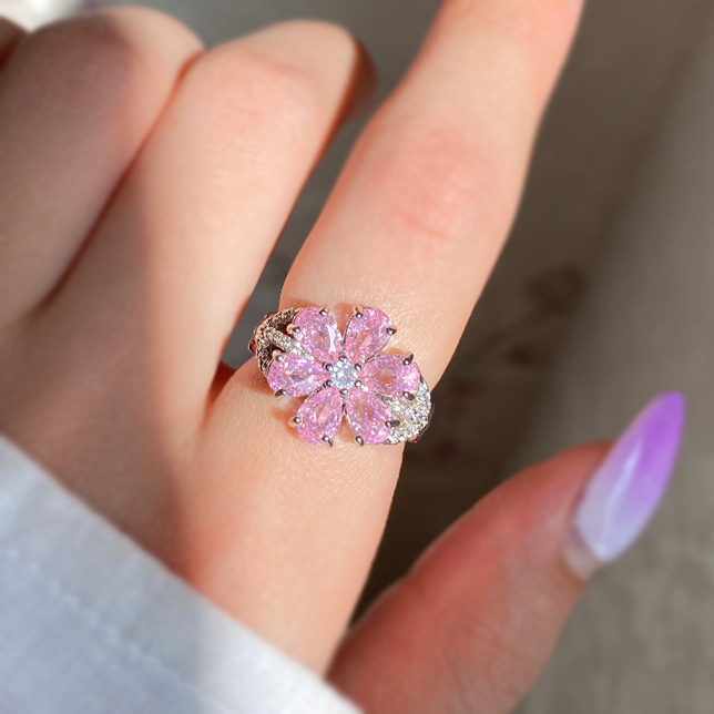 انگشتر گلمانند با نگینهای صورتی درخشان؛ طراحی فانتزی و مناسب مهمانیهای دوستانه و روزمره