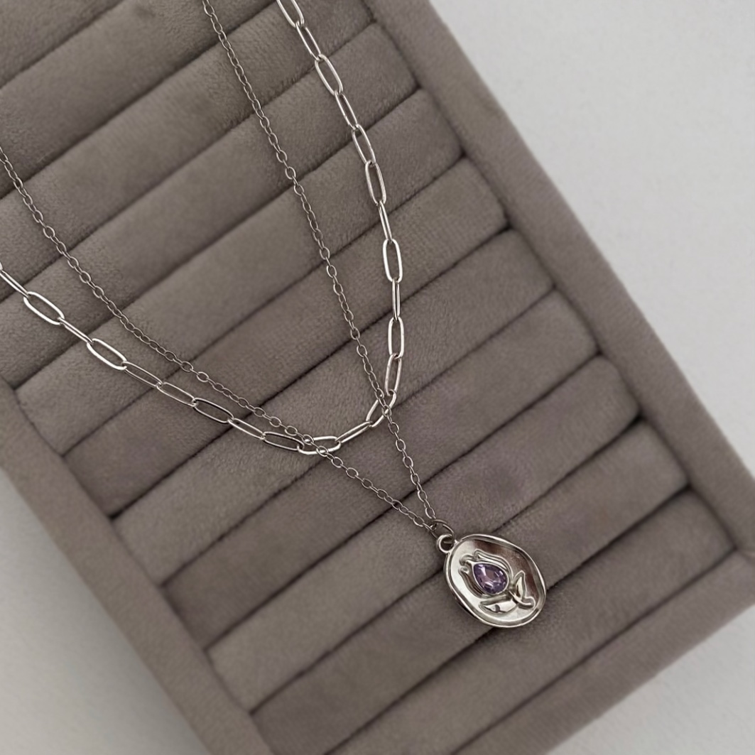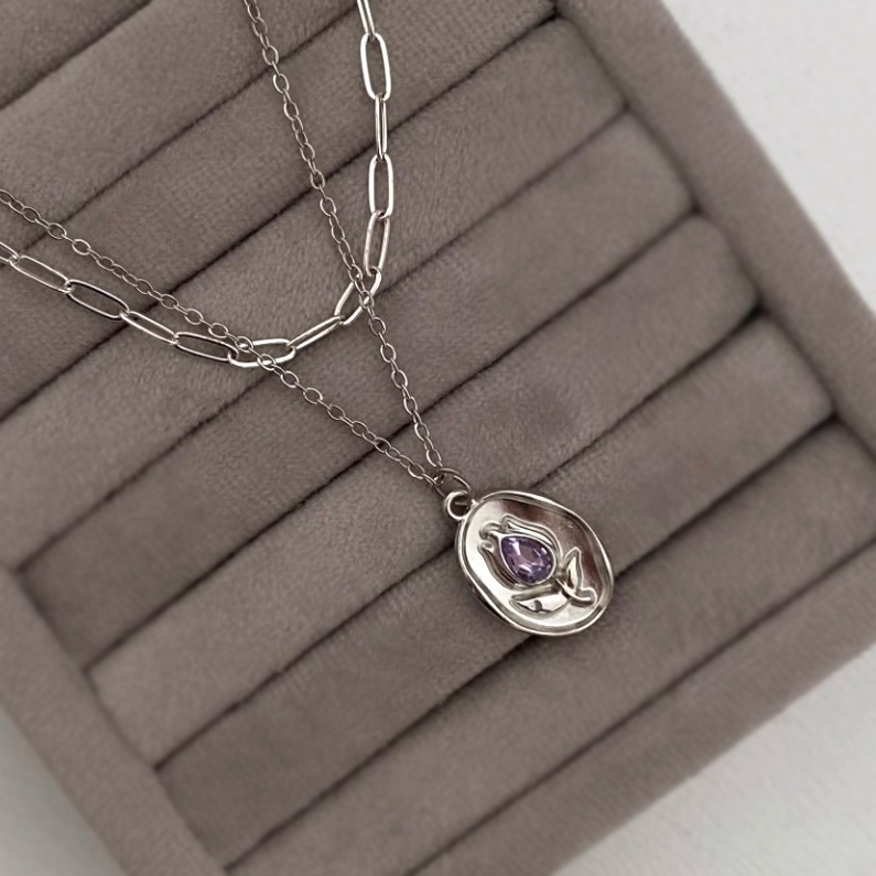 گردنبند گل لاله نقره ای با نگین بنفش دو لاین