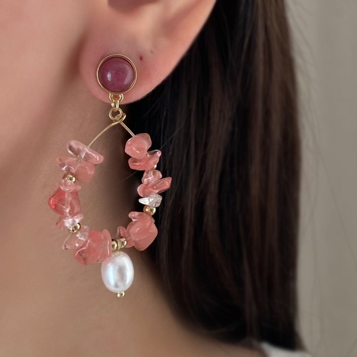 سنگ های گلبهی و مروارید سفید و نگین بنفش و مروارید های ریز طلایی یه ترکیب رنگ فوق العاده زیبا ساختن