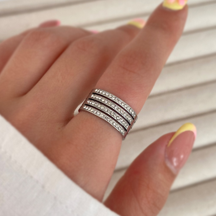 Four-line silver ring with steel jewels